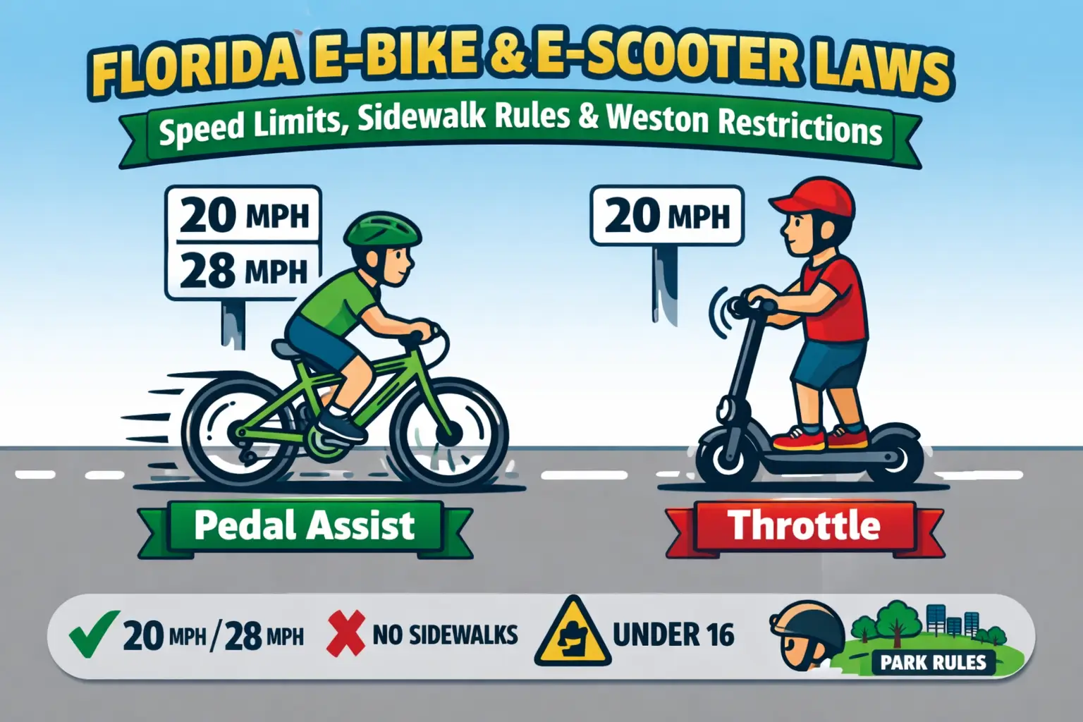 Electric bikes and electric scooters are now common across Florida neighborhoods, sidewalks, and parks. But Florida law draws clear legal boundaries based on speed capability, device classification, and location—and local governments, including the City of Weston, can impose additional restrictions.
